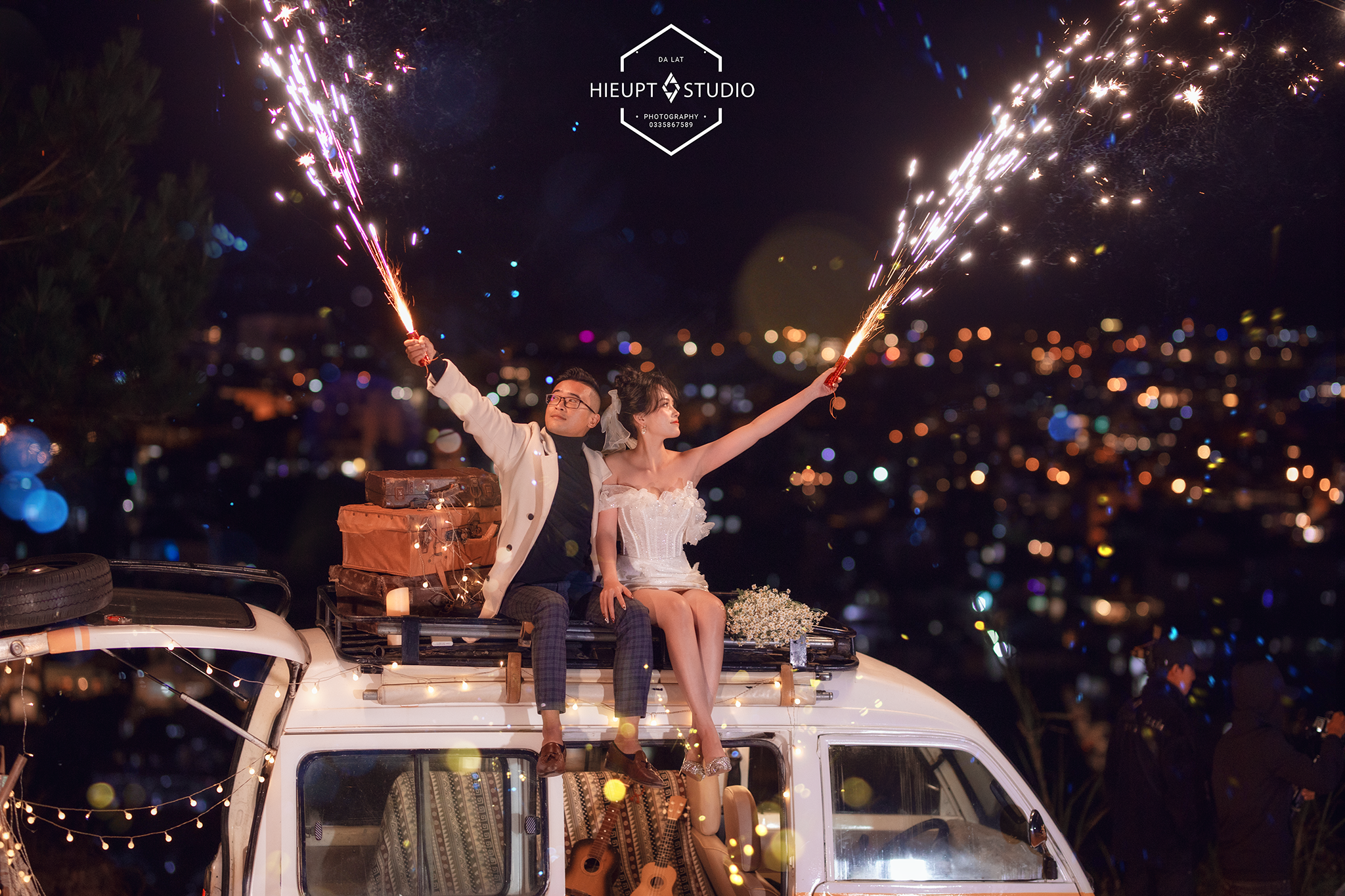 Trên tay cầm cây pháo sáng tạo nên những khoảnh khắc lung linh là kỉ niệm sẽ luôn đi cùng năm tháng đồng hành cùng dâu rể khi chụp đêm Trên Đà Lạt cùng Hieupt Studio